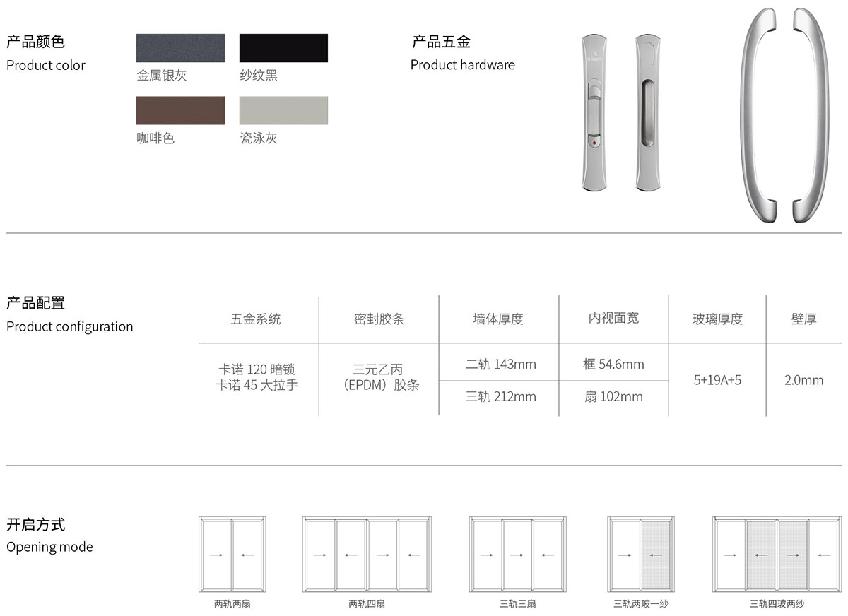 - 采用國家標準高精級鋁型材及卡諾專展定制五金配件 ,豪華大氣 ,內置多鎖點的結構設計 ,令防盜、安全性能更為優越。